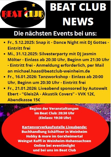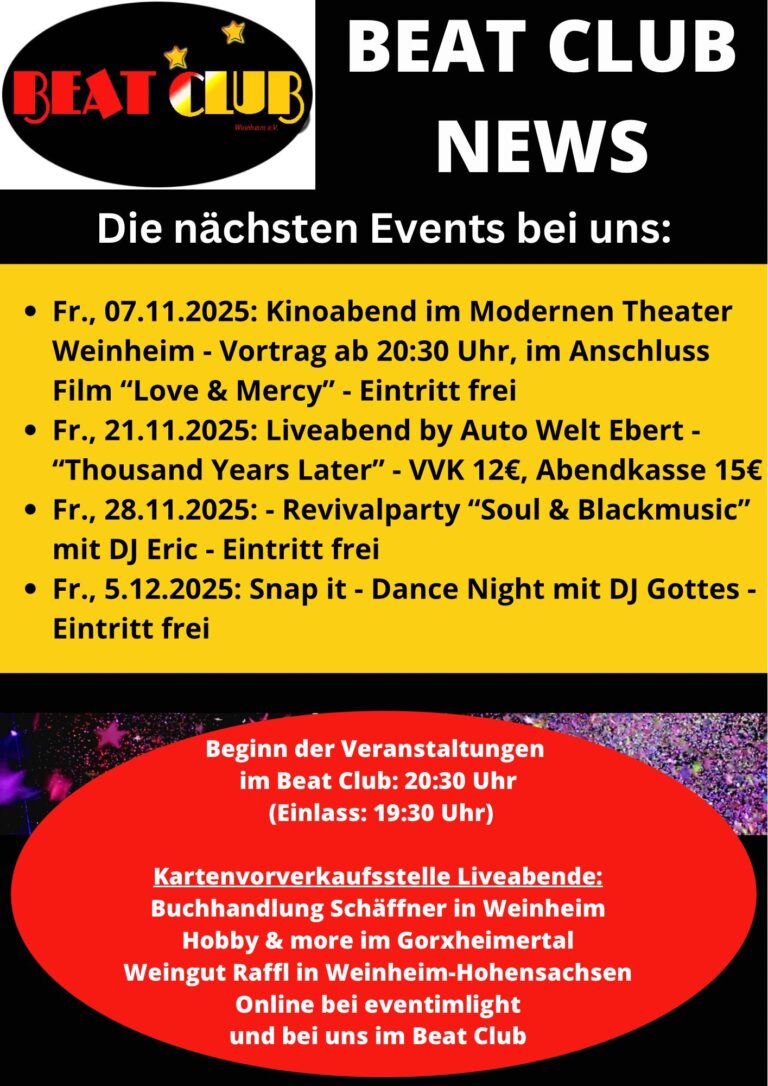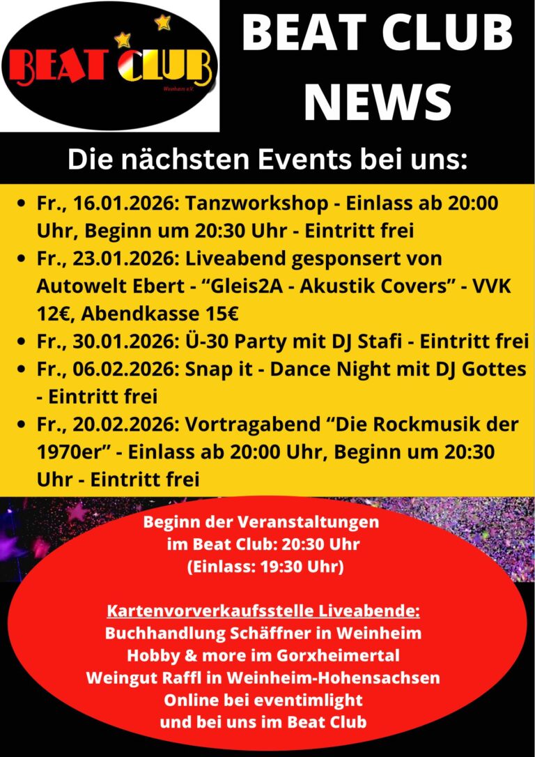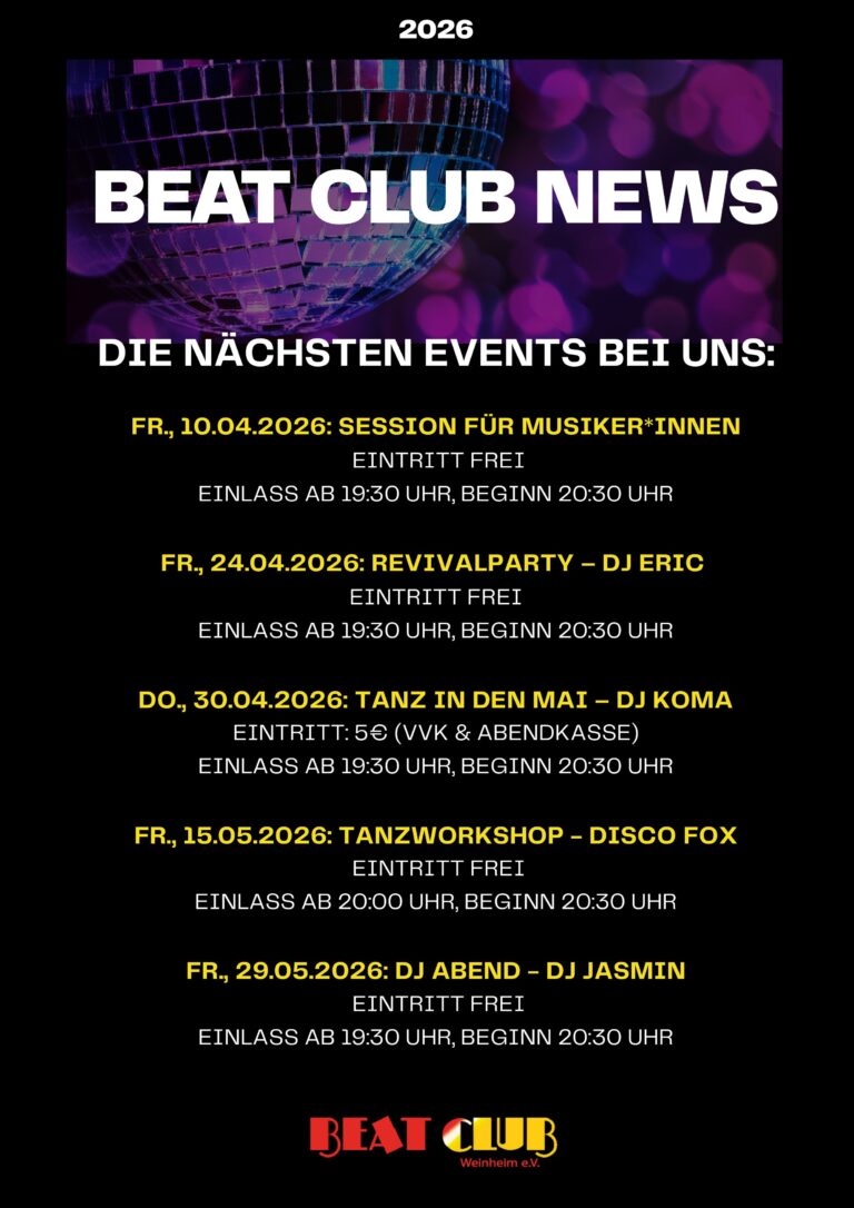 Wir freuen uns auf Euren zahlreichen Besuch und wünschen viel Freude bei unseren zahlreichen Veranstaltungen im Beat Club Weinheim!
